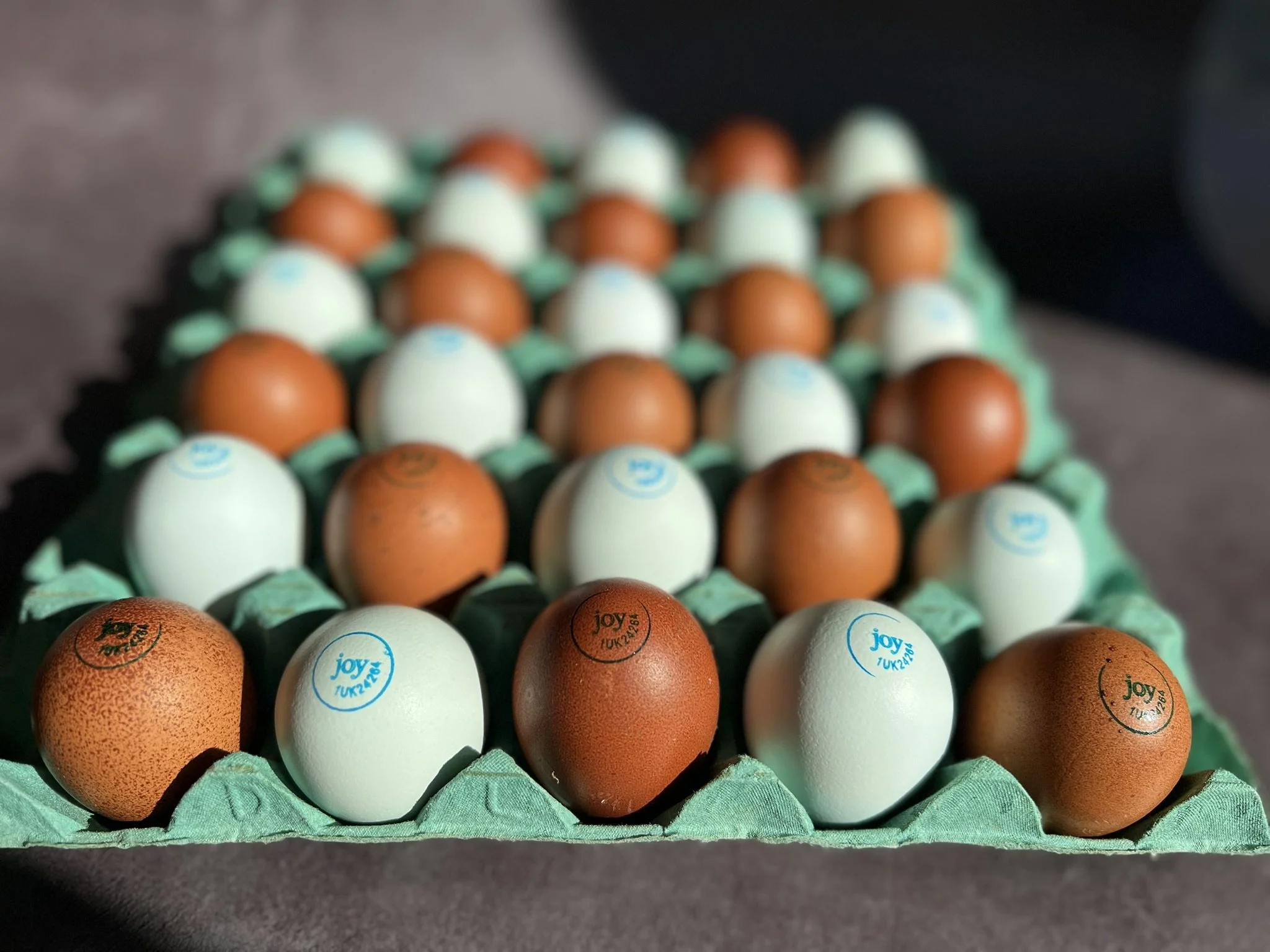 Supermarket eggs often come from flocks of 16,000 hens or more. At Joy Farms, our hens live in flocks of 60-200. That difference shows in every egg. When you buy ours, you’re choosing: